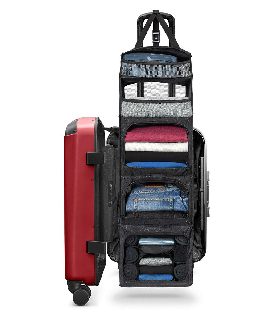 This innovative suitcase is made from recycled ocean-bound plastic and features a built-in shelving system that helps travelers stay organized without additional packing cubes.